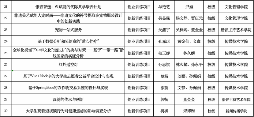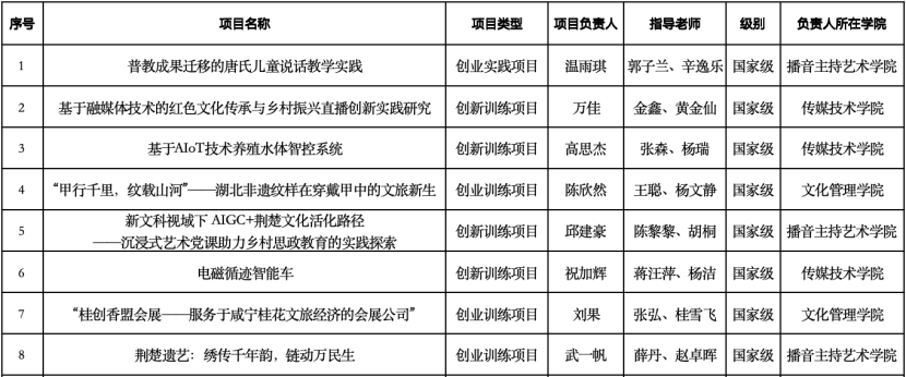 根据《教育部高等教育司关于开展2025年国家级大学生创新训练计划立项和结题验收工作的通知》、《国家级大学生创新创业训练计划管理办法》(教高函〔2019〕13号)等文件要求,按照学校项目管理安排,武汉传媒学院组织开展了2025年大学生创新训练计划项目暨第八期资助育人教育实践项目结项工作。经审核验收,我校8个国家级项目,12个省级项目,10个校级项目通过验收同意结项。具体名单如下: