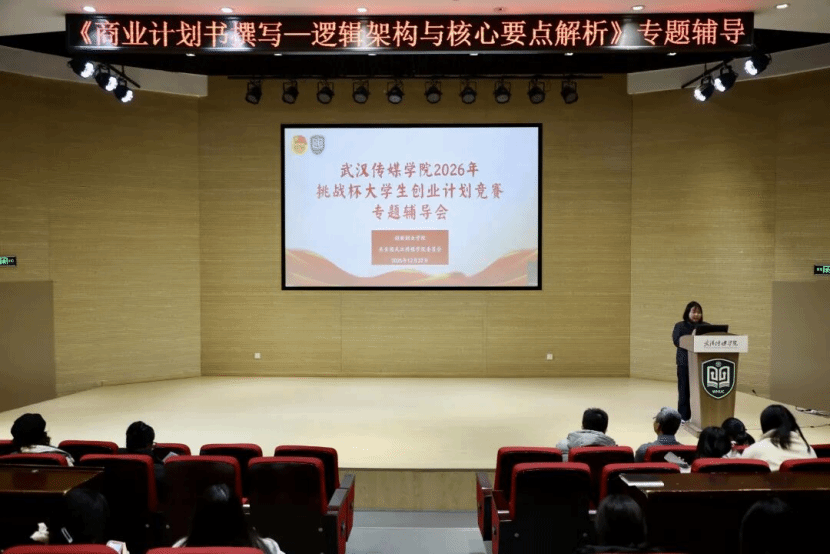 2025年12月22日下午,创新创业学院联合武汉传媒学院团委在武汉校区圆形报告厅成功举办2026年“挑战杯”大学生创业计划竞赛专题辅导会。本次会议以《商业计划书撰写——逻辑架构与核心要点解析》为主题,聚焦提升师生项目培育质量,为2026年“挑战杯”全国大学生创业计划竞赛备赛工作夯实基础。全体参赛学生及指导教师现场参会,大悟校区同步开展线上直播,实现师生全覆盖。