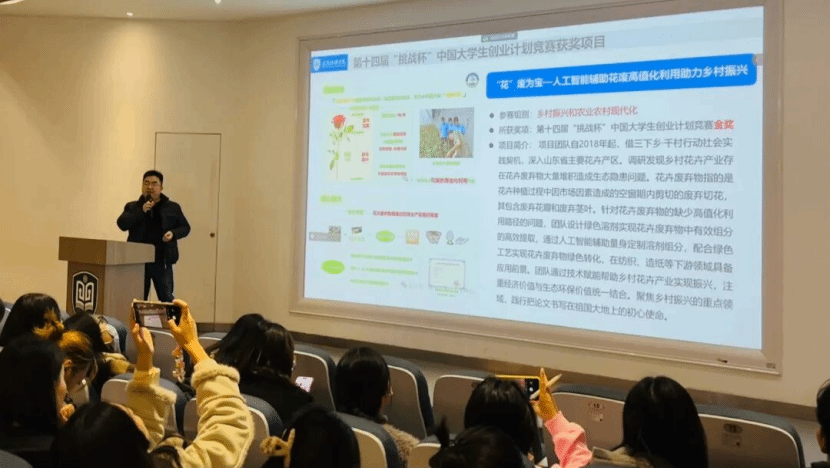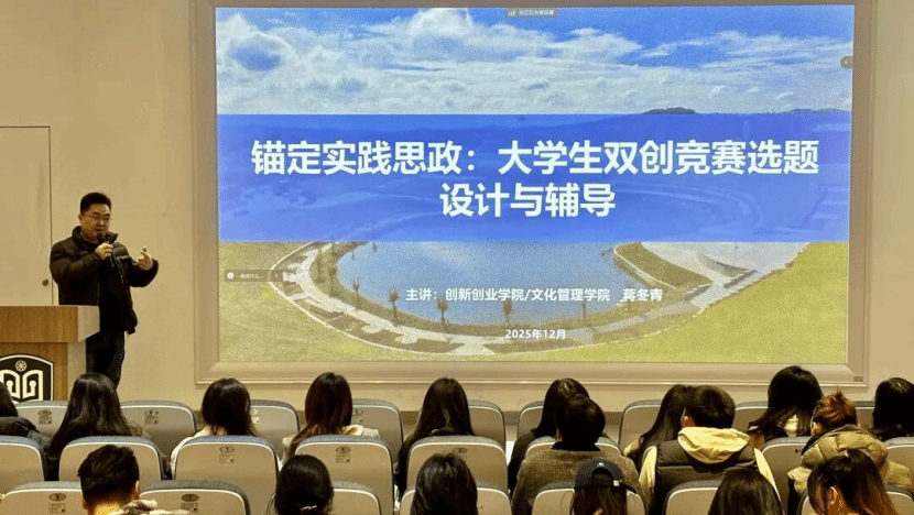 讲座中,蒋冬青教授深入解读了“挑战杯”竞赛的本质特征,厘清了核心导向。他围绕项目创新性、科学性、实用性三大核心指标,结合团队协作、现场展示等评分点,全面剖析了竞赛评审逻辑;还结合近年趋势,列举了双创赛事的十大高频选题,拆解了其切入点与潜力,并讲解了选题设计方法。