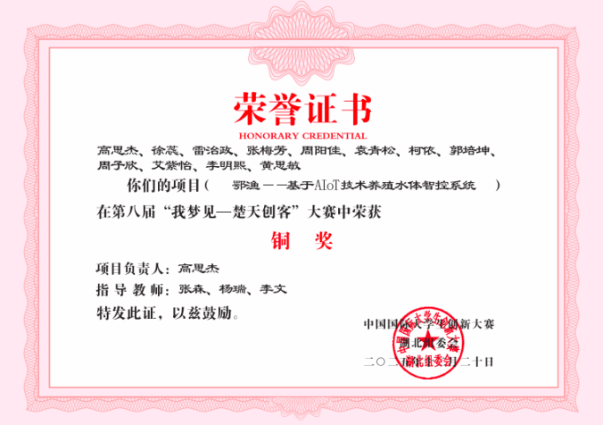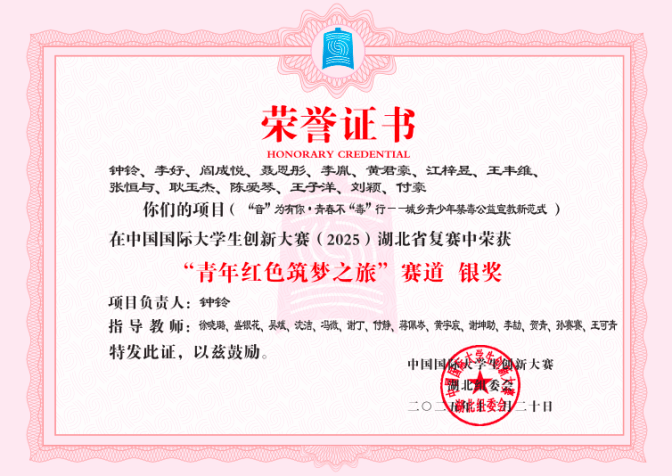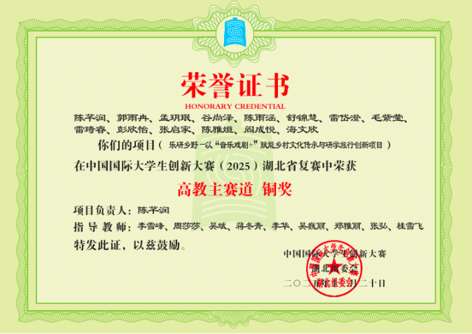 中国国际大学生创新大赛(2025)启动以来,我校党委和各相关部门高度重视本项赛事,积极统筹谋划,组织大赛专家和指导老师为各项目团队提供多方面支持和针对性辅导,旨在提升参赛项目质量,提高学生创新实践能力。最终,我校《“音”为有你·青春不“毒”行--城乡青少年禁毒公益宣教新范式》项目获得“青年红色筑梦之旅”赛道银奖,《银龄乐启一老龄化社会沉浸式音乐记忆重构剧场》、《乐研乡野一以“音乐戏剧+”赋能乡村文化传承与研学旅行创新项目》项目获得高教主赛道铜奖,《鄂渔--基于AI0T技术养殖水体智控系统》项目获得第八届“我梦见-楚天创客”大赛铜奖,充分展示了我校在创新创业教育方面的显著成效。